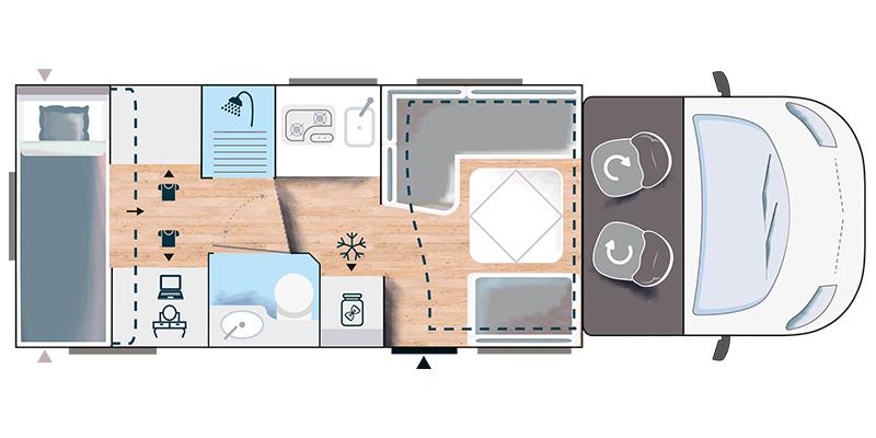 The family motorhome per excellence, it can accommodate up to 5 travellers. The rear bedroom can accommodate 2 children thanks to its 2 single bunk beds. The upper bed is equipped with a protective net. The "smartlounge" maxi living room with face-to-face bench seat is spacious. The kitchen is functional, its equipment is standard: fridge, 2-burner gas hob and a sink. A drop-down bed 2 places 160 by 190cm and a convertible dinette bed 2 places complete the sleeping arrangements. The shower and WC are independent, but by modulating the space, you can combine them in the bedroom to save space and have access to the dressing closet. The bench seats in the living room convert into 2 road seats fitted with isofix mountings. Finally, a large hold is accessible from the outside, ideal for storing beach gear, outdoor furniture or just your suitcases.