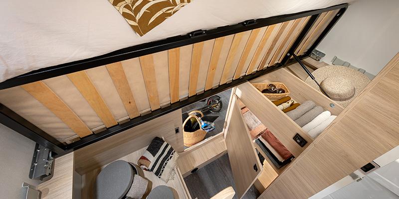 The Mini Low Profile is an ideal motorhome for two people. The layout has been designed like that of a van but with the space specific to a motorhome. Ideal for novices thanks to its mini format, you will taste the joys of traveling in a motorhome in complete freedom. At the rear, a transverse double bed of 140 by 190cm, underneath is a large chest accessible from the outside. The bathroom is innovative. The wall where the washbasin is located pivots to reveal the shower. Finally, a fully equipped and functional kitchen (sink, fridge, gas hob) and a dining/lounge area with table, 2-seater benches and 2 swivel front seats.